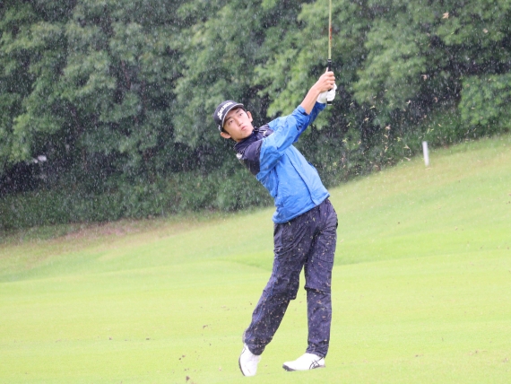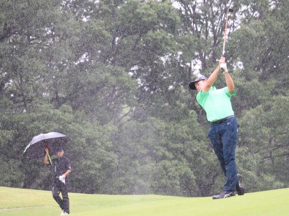 全日本アマチュアゴルファーズ選手権は、2日間を通して生憎の雨の中で開催されました。折しも初日の6月10日は東海地方に梅雨入り宣言が出された日。その発表どおり、雨は第1組のスタート時間帯から本降りに。殆どの選手がレインウェアを着こみ、ショットを打つたび激しい水しぶきが上がるようなコンディションの中、さすが全日本アマ選出場選手はそんな雨をものともせず、初日からバーディ合戦の様相。トップの上田涼真選手(16歳)が8バーディを奪えば、初日2位につけた亥飼陽選手(19歳)はインコースで5連続バーディの猛攻。「雨が降ればグリーンが柔らかくなり、ボールが止まりやすくなるから雨は全く気にならない」のだとか。一般のアマチュアなら尻込みしてしまうような大雨でも、彼らにとっては好都合のようでした。